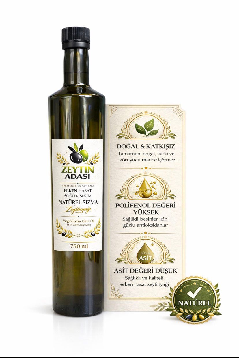 Zeytin Adası Erken Hasat Soğuk Sıkım Natürel Sızma Zeytinyağı – Koyu Cam Şişe (750 ml)
